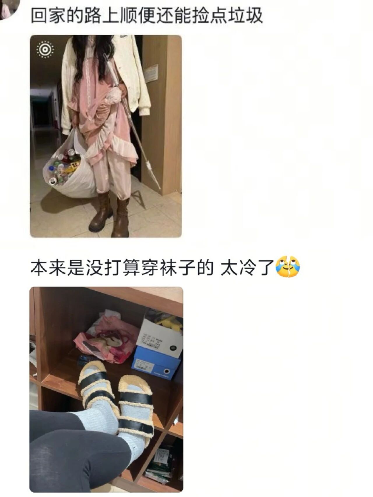 最近北方的朋友们怕是都体验了 “一秒入冬” 的魔幻,前几天还短袖加薄外套,这两天就裹着羽绒服瑟瑟发抖了。社交平台上,“降温后的恶心穿搭” 成了热门话题:有人晒出“出门扔垃圾式”混搭,睡衣外直接套毛衣,再披件颜色不搭的旧外套;有人吐槽 “衣服捞到哪件穿哪件”,反正不成套;还有人一手拎着塑料袋出门,自嘲 “顺路还能捡点废品”。
