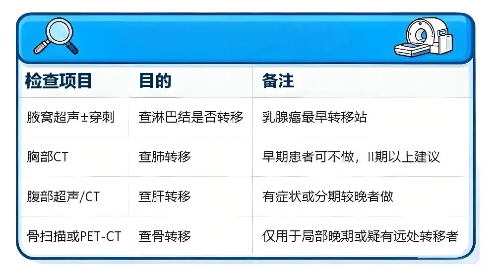 腋窝超声/CT:查腋窝淋巴结有没有转移(乳腺癌最容易先转移到腋窝淋巴结)。
