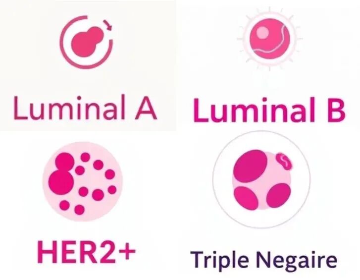 通过病理报告上的雌激素受体(ER)、孕激素受体(PR)、HER2基因和Ki-67指数,目前乳腺癌可分为四种主要的分子亚型: