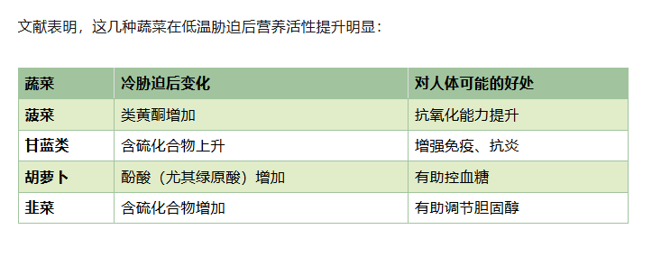 含硫化合物:十字花科蔬菜(例如卷心菜、羽衣甘蓝)含有一类叫硫代葡萄糖苷的化合物。低温胁迫能显著提高它们的含量。以羽衣甘蓝为例,一项研究发现,植物在-8 °C条件下,其总硫代葡萄糖苷含量比常温高出很多。 这些含硫分子在植物中是防御虫害的武器。对人体而言,它们能转化生成对健康有益的代谢物(如萝卜硫素等),对免疫力和炎症都有潜在支持作用。