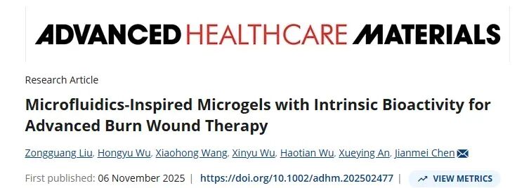 [4] Liu Z, Wu H, Wang X,et al. Microfluidics-Inspired Microgels with Intrinsic Bioactivity for Advanced Burn Wound Therapy[J]. Adv Healthc Mater. 2025 Nov 6:e02477. Doi: 10.1002/adhm.202502477.