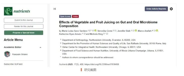 [9]MariaLuisaSavoSardaroetal,EffectsofVegetableandFruitJuicingonGutandOralMicrobiomeComposition,Nutrients(2025).DOI:10.3390/nu17030458