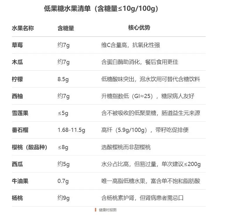 南京医科大学附属逸夫医院内分泌科副主任医师曹维在该院公众号刊文表示,水果虽富含维生素、膳食纤维和矿物质,但痛风及高尿酸血症患者需优先选择果糖含量低的品种。高果糖水果(含糖量超过12克/100克)天然糖分浓缩,需严格控量,尤其不适合血糖敏感人群;《中国高尿酸血症相关疾病诊疗多学科专家共识(2023年版)》指出,高尿酸血症患者可食用樱桃、草莓、菠萝、桃子等低果糖水果(含糖量≤10克/100克),蓝莓、杏等也属于低糖梯队,可适量食用。
