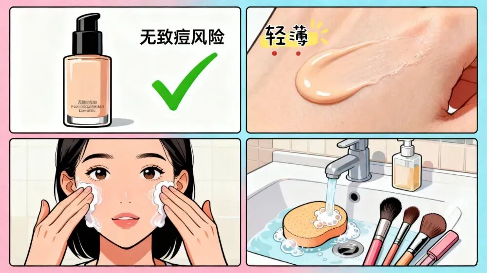 对痘痘肌来说,防晒比粉底更重要。选择轻薄质地、物理防晒为主(如含氧化锌、二氧化钛)的产品。底妆可用轻薄粉底液或气垫,避免层层叠叠上妆,妆感厚重容易阻塞毛孔。