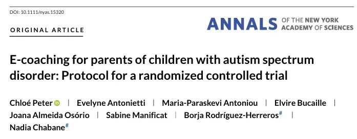 [4] Peter C, Antonietti E, Antoniou MP,et al. E-coaching for parents of children with autism spectrum disorder: Protocol for a randomized controlled trial. Ann N Y Acad Sci. 2025 May;1547(1):143-153. Doi: 10.1111/nyas.15320.