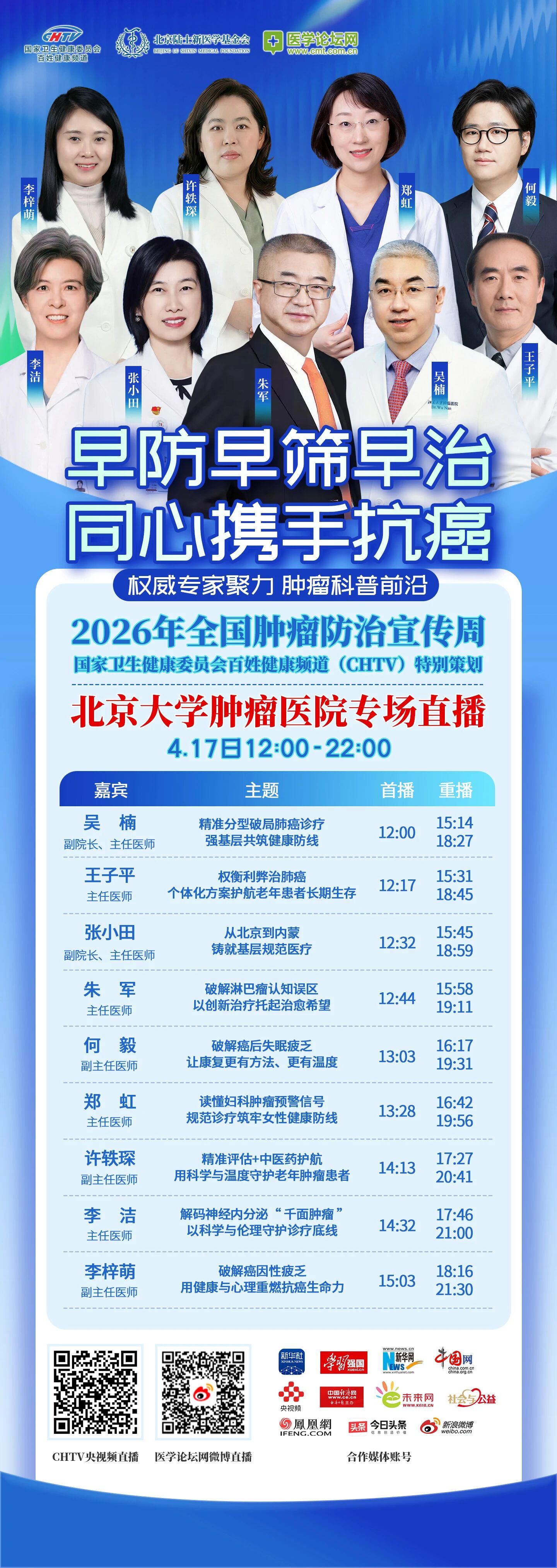 【明日上线】2026全国肿瘤防治宣传周,国家卫生健康委员会百姓健康频道(CHTV)联合北京大学肿瘤医院,将于4月17日12:00-22:00推出北京大学肿瘤医院专场直播。权威专家聚焦肺癌、淋巴瘤、妇科肿瘤等前沿诊疗,从精准分型到个体化方案,从强基层到人文关怀,聚力科普,护航生命。