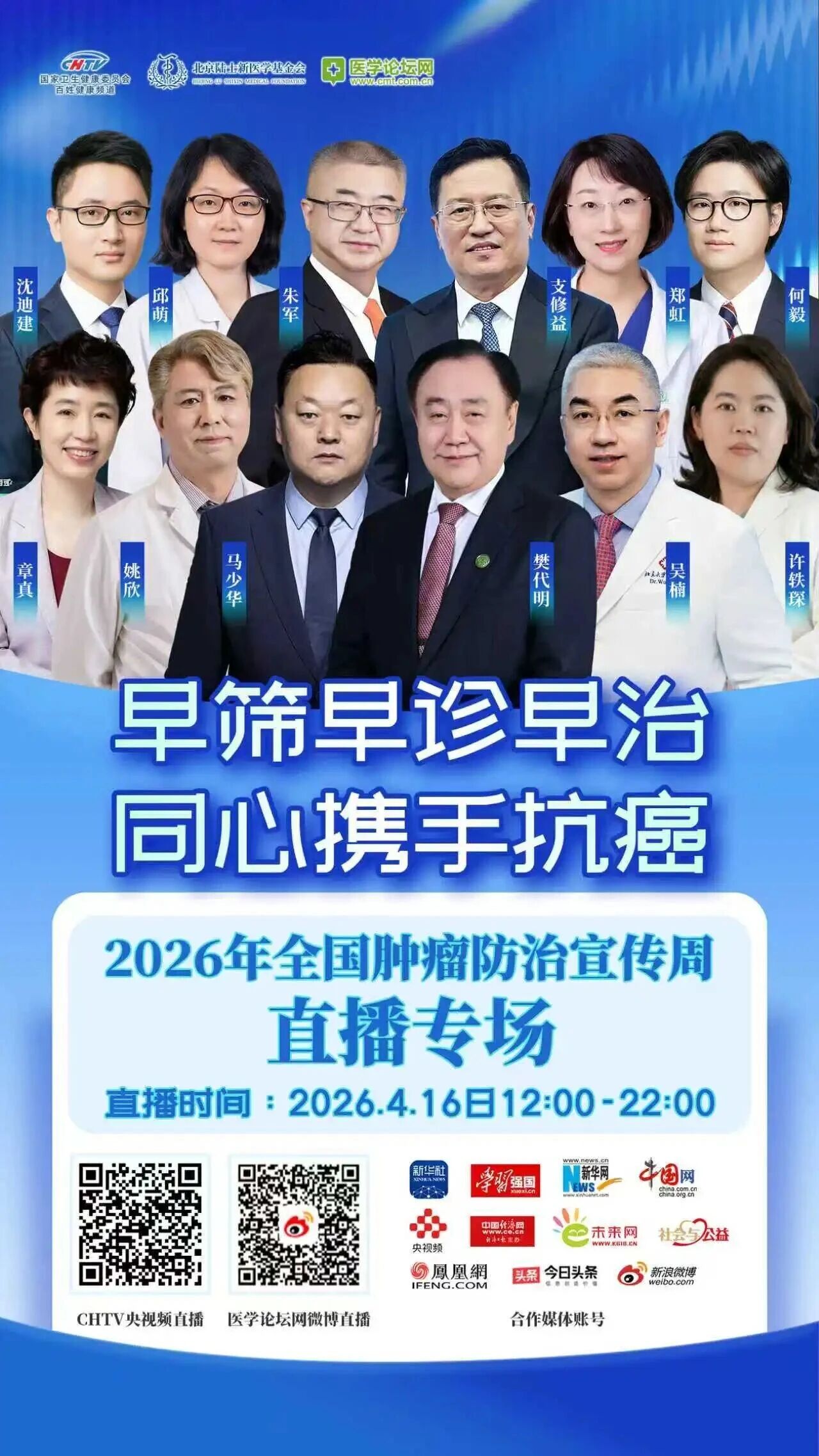 2026年全国肿瘤防治宣传周期间,国家卫健委百姓健康频道(CHTV)联合北京陆士新医学基金会、医学论坛网,于4月16日12:00-22:00推出“早防早筛早治 同心携手抗癌”10小时直播专场。汇聚权威专家,聚焦防筛前沿,让科学防癌理念走进千家万户,为“健康中国2030”贡献媒体与公益力量。