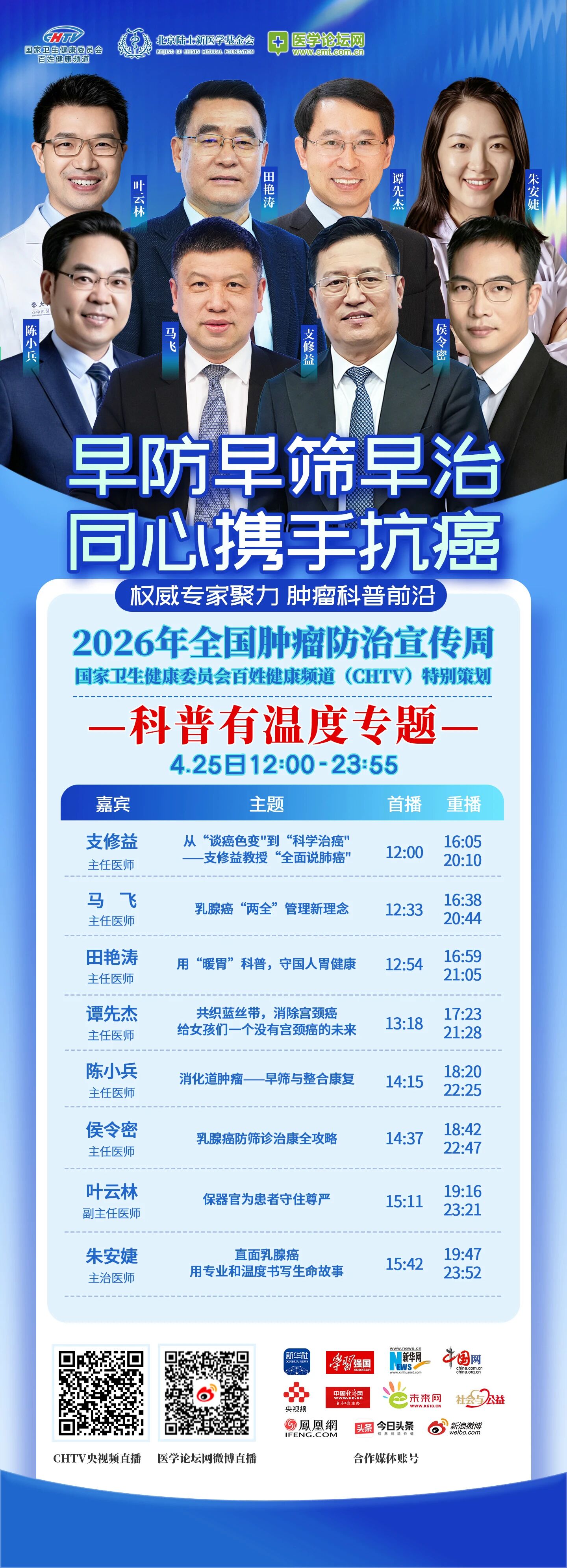 【明日上线!】2026全国肿瘤防治宣传周,CHTV联合陆士新医学基金会,推出“科普有温度”专题直播。支修益、田艳涛、谭先杰、马飞、陈小兵等权威专家温情开讲,从“谈癌色变”到科学治癌,覆盖肺癌、胃癌、宫颈癌、乳腺癌及消化道肿瘤,传递全程管理与整合康复新理念,守护患者尊严与希望。4月25日12:00-23:55,锁定CHTV,感受有温度的肿瘤科普。