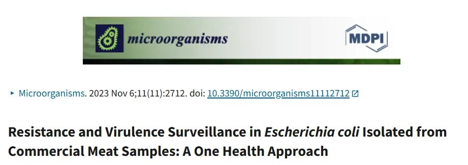 [4] Menck-Costa MF, Baptista AAS, Sanches MS, et al. Resistance and Virulence Surveillance in Escherichia coli Isolated from Commercial Meat Samples: A One Health Approach[J]. Microorganisms. 2023 Nov 6;11(11):2712. Doi: 10.3390/microorganisms11112712.