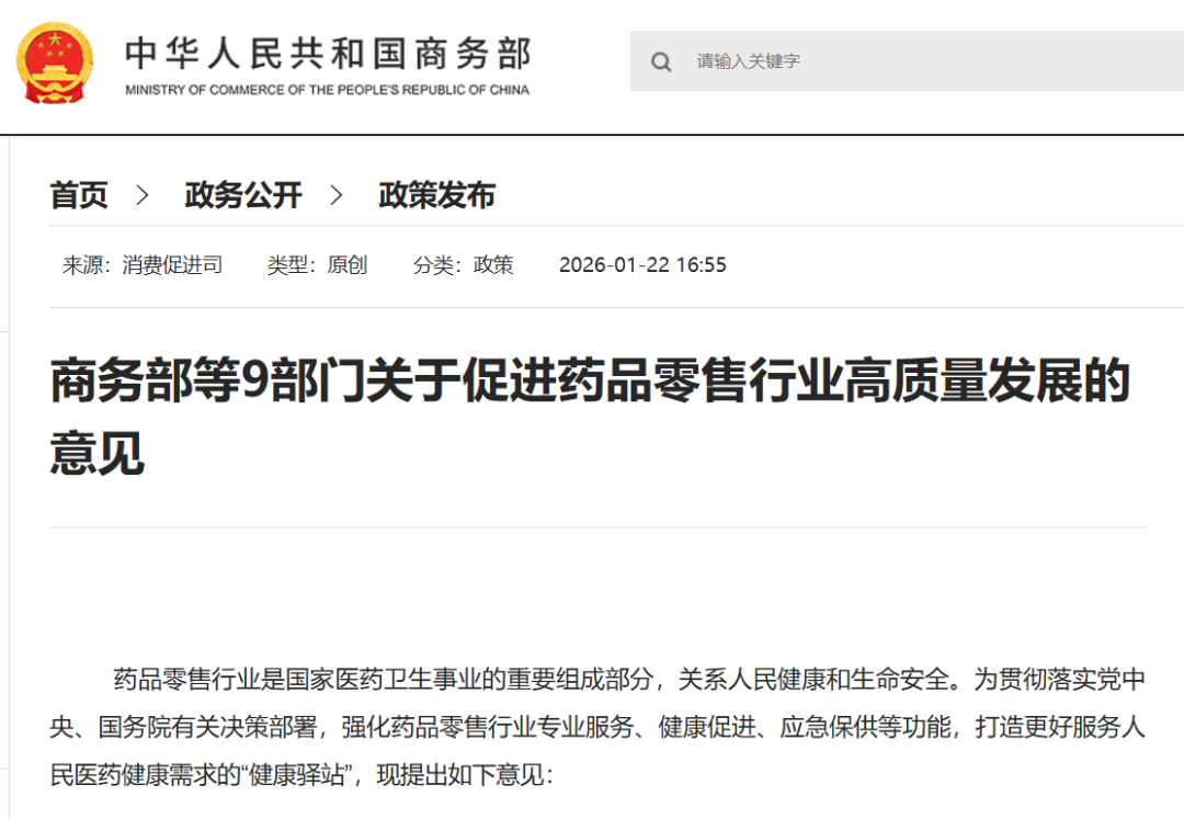 1月22日,商务部、国家发展改革委等九部门联合发布《关于促进药品零售行业高质量发展的意见》。《意见》围绕完善药事服务、强化应急保供等五方面,提出18项具体举措。