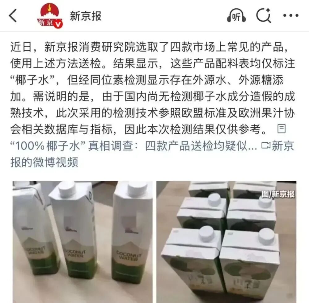 然而,近日,椰子水竟然“塌房了”......新京报消费研究院在公证处监督下,送检 4 款热销 “100% 椰子水”,采用欧盟稳定同位素指纹技术检测,结果四款全中招:3款检出外源水与外源糖,1款含淀粉源糖浆,原汁占比最低仅 10%,配料表均造假。一时间,所谓的“天然营养”沦为营销噱头。